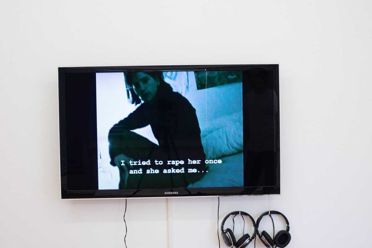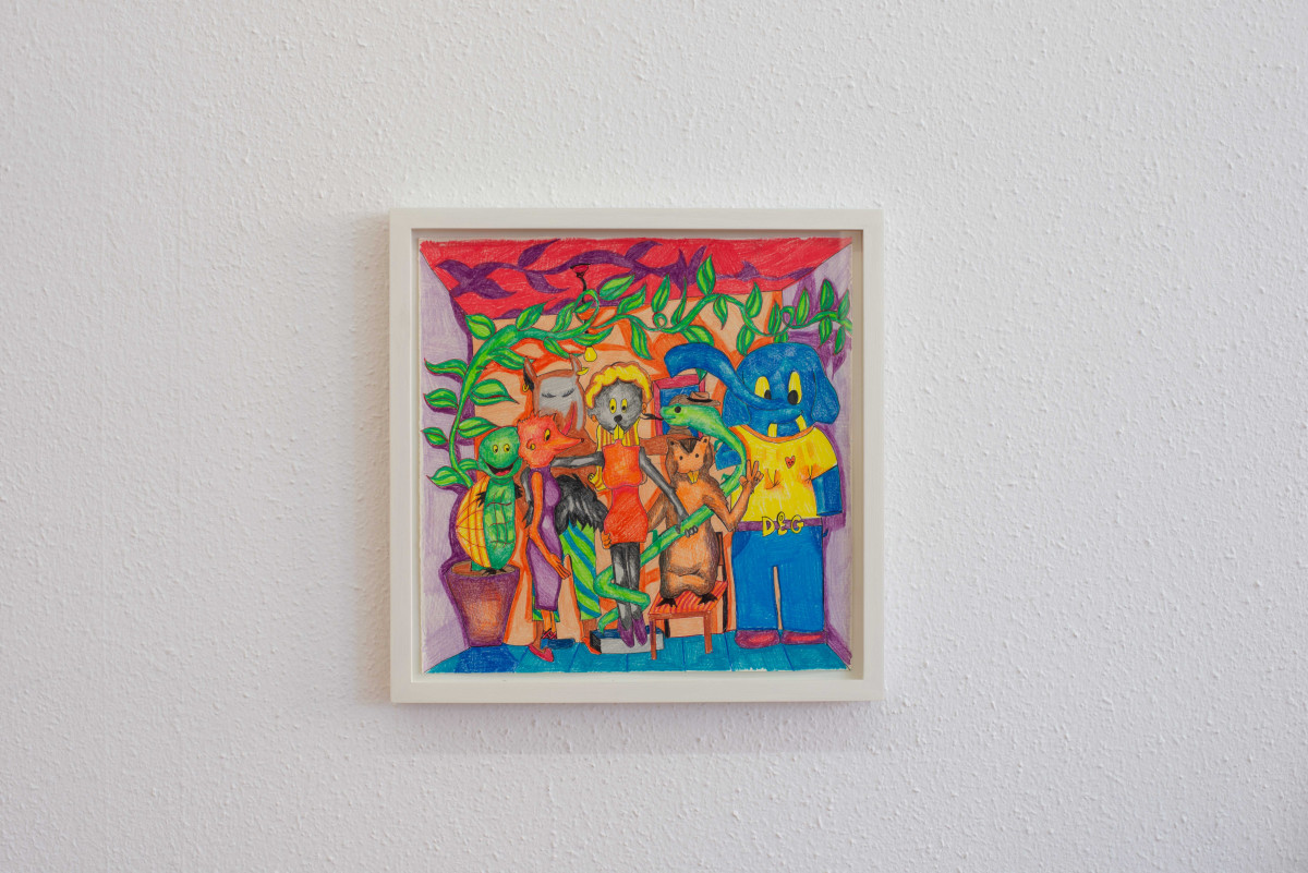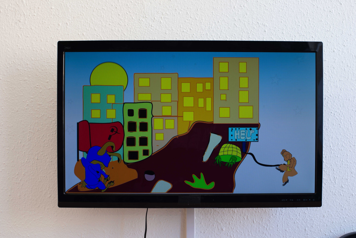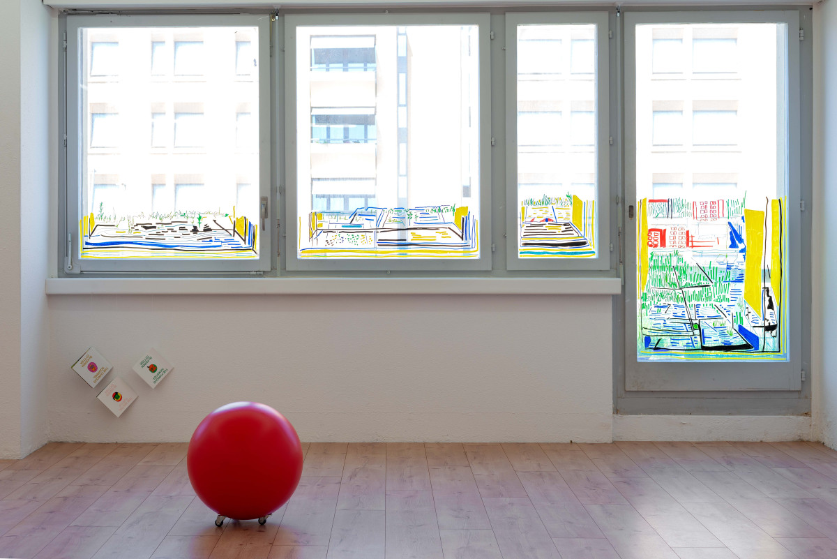 Obwohl die Zeichnungen mit Filzstift und die ortsspezifisch entstandenen Fensterzeichnungen des ersten Raumes auf der Horizontlinie von Kinderaugen liegen, konfrontieren sie, wie auch die zwei animierten Videos, mit der Tragik des Erwachsenwerdens.