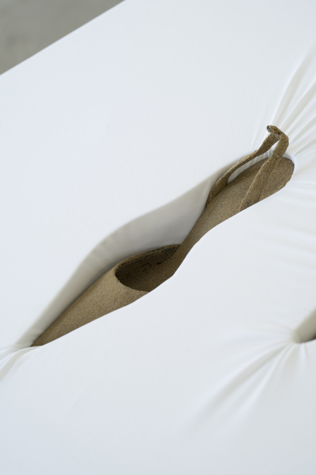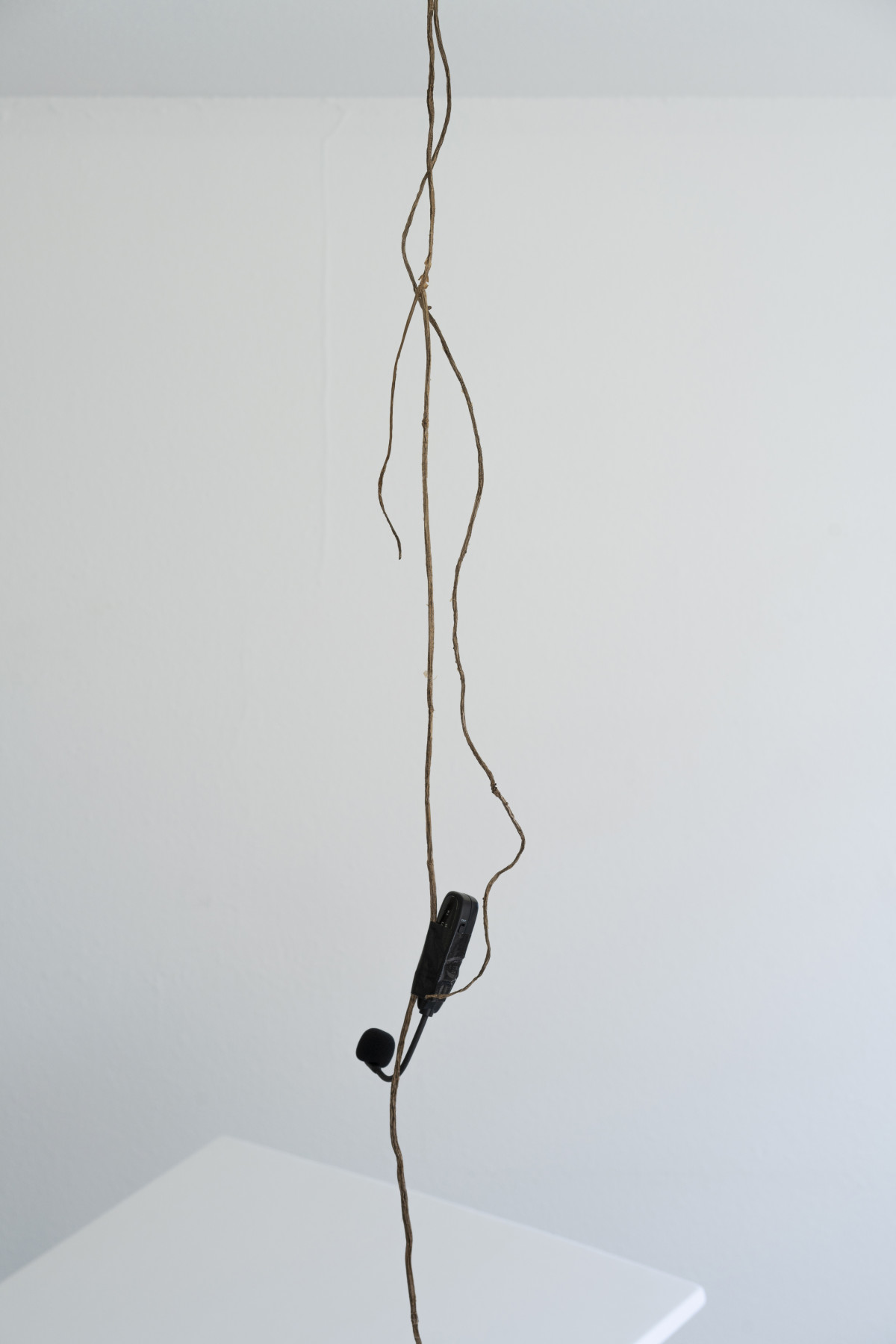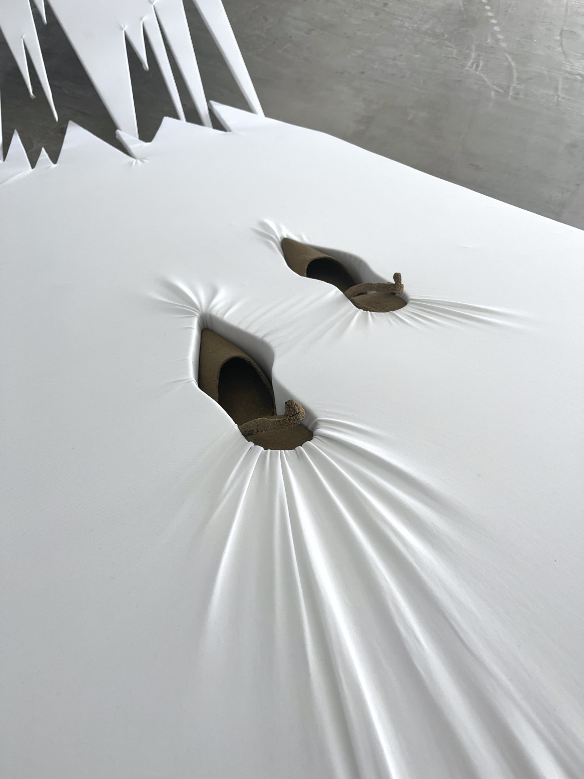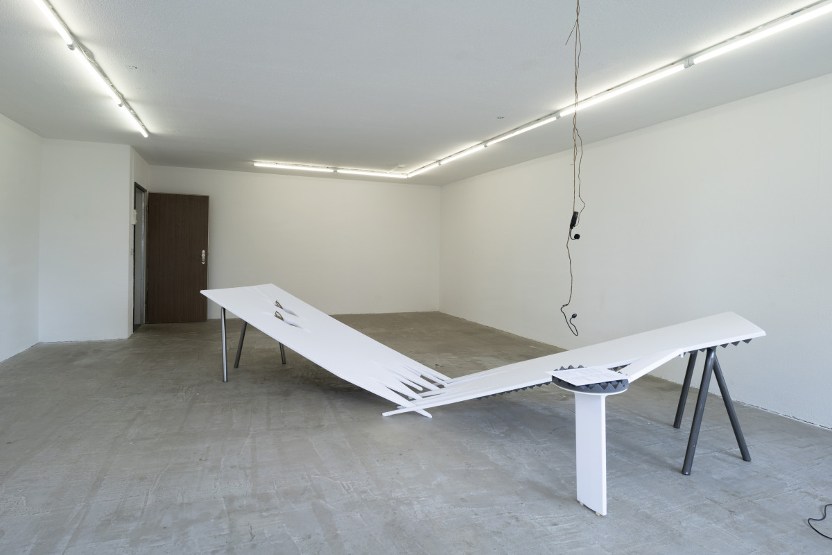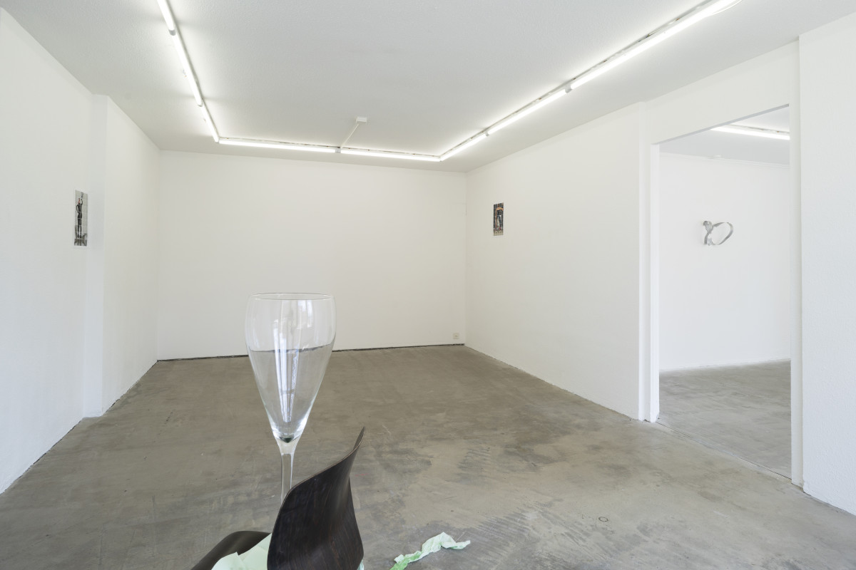 The exhibition turned out quite nicely. An absurd scenario. But only just absurd enough that the absurdity doesn‘t impose itself on us. A long table broken in two, 15cm stilettos embedded in the tabletop - supposed witnesses of a scene, a speech act, a lecture: lecture of what? The fracture abstract, the Zig Zag‘s only pretend to be in positive-negative relation to each other. The halves of the table don‘t fit, you can see that! A liana grows out of the ceiling, its fruit a headset. Actual witness of a reading. The speaker - Mara - talks about the speaker, the speaking, the failure of it. Her act of speaking as an „uncanny mirror held up to the speaker (listener), one that concretizes a desire in the process of beco- ming“ (Moyra Davey)? Alienated bodies - there she is again, the artist herself - collaged extremities, absurd beings. So simple, Mara makes no secret of how the collages came about. There is also the fly, the bait fly, sitting on an object that reminds us of some device, context unknown. A FLY CAN SAVE A SHITTY PAINTING. The oversized wine glass speaks the same language of misappropriation. The event is coherent in its absur- dity. The absurdity is in the coherence.